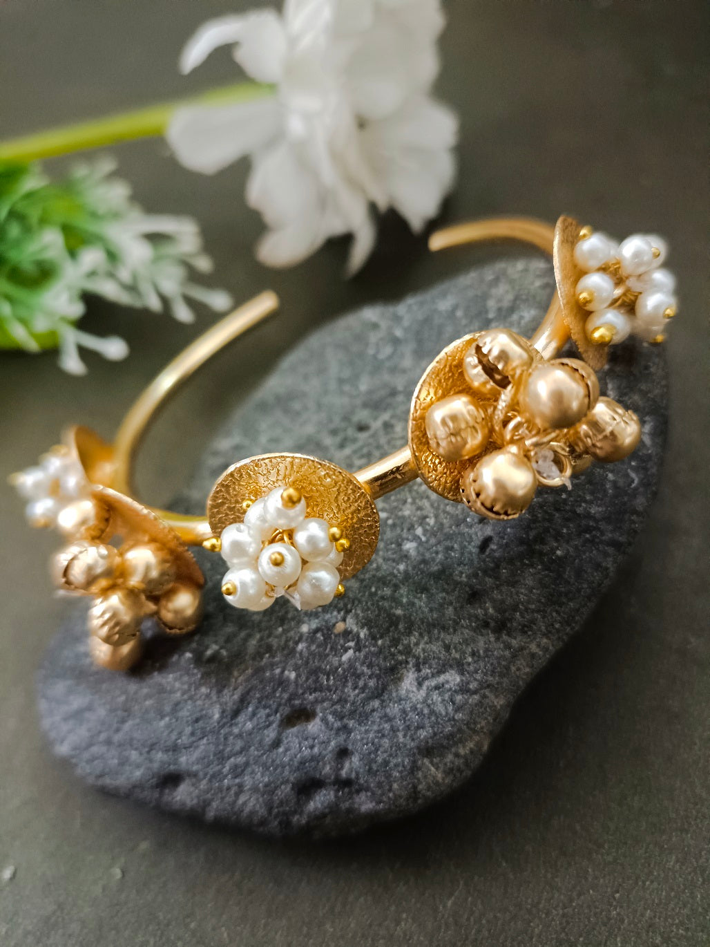 Sanjog Modern Gold-Tone Open Cuff Bracelet with Pearl and Ghungroo Cluster Accents