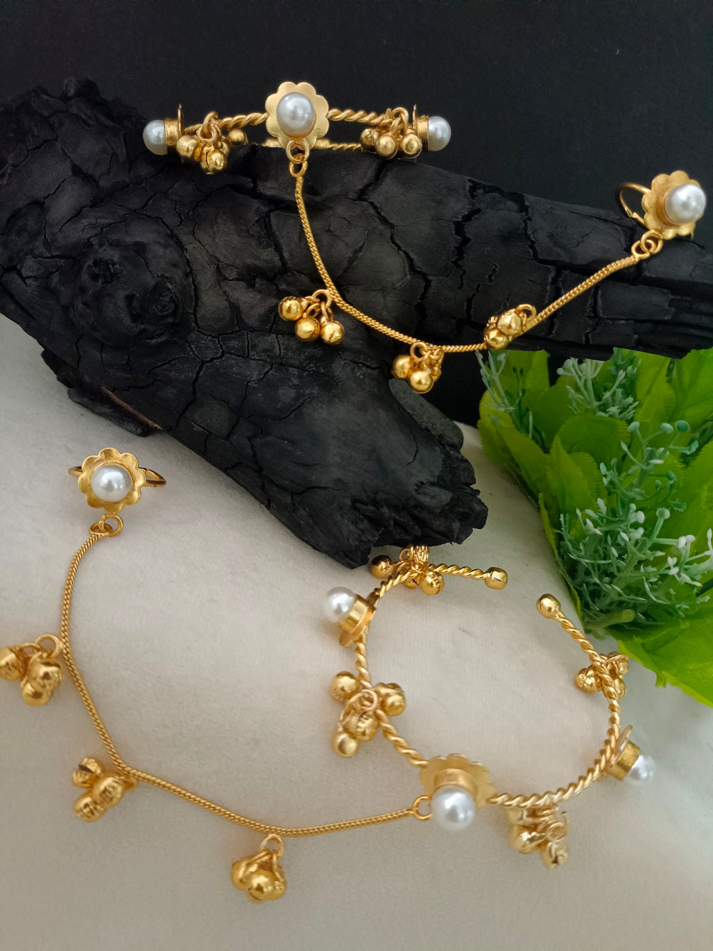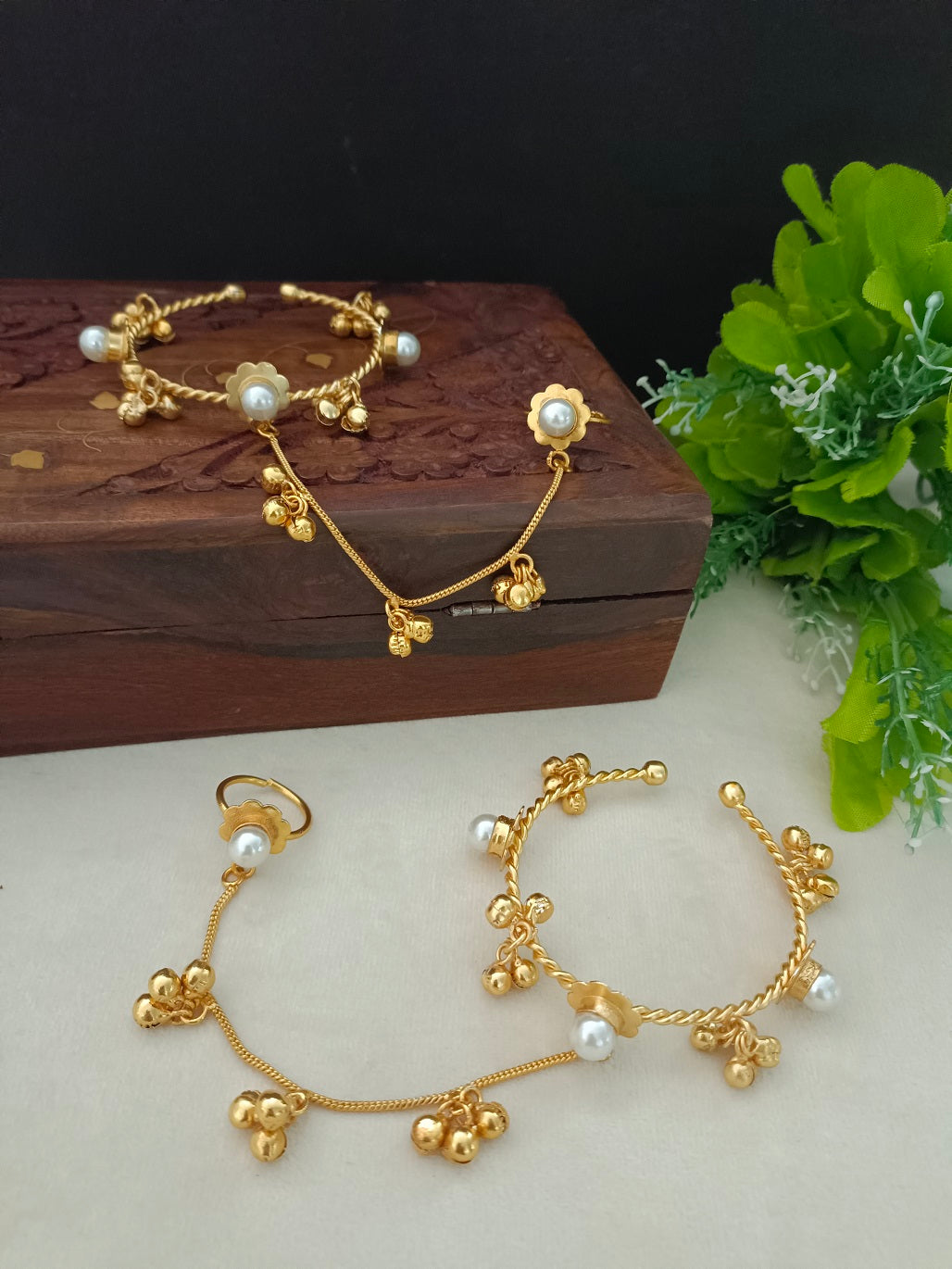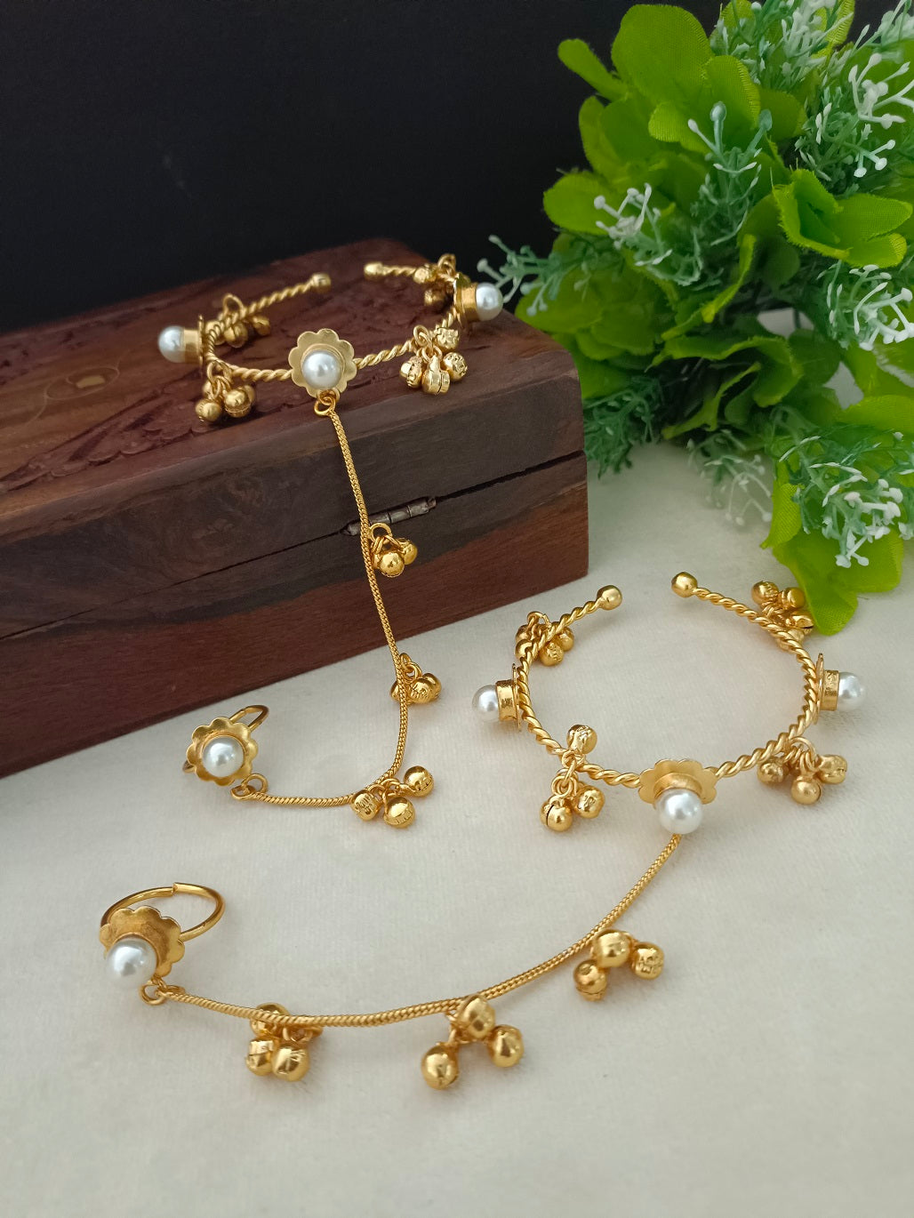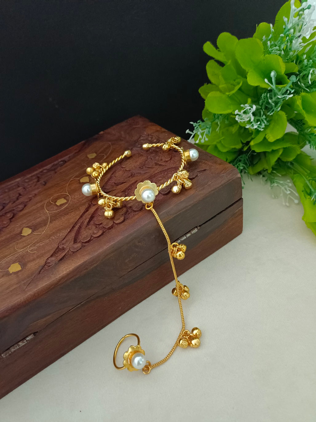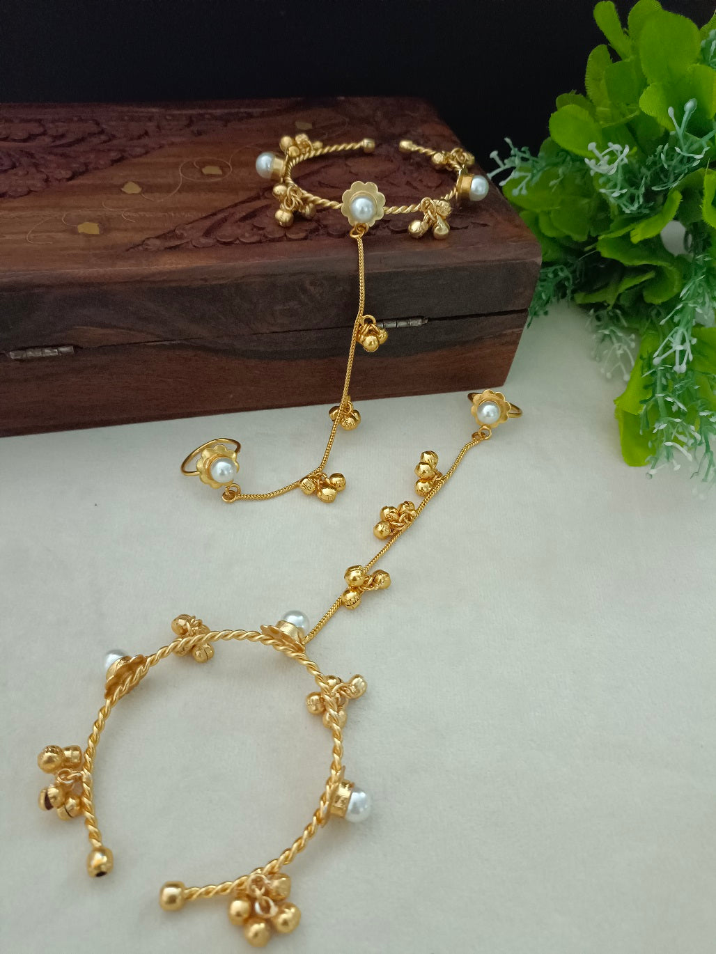 Women 2 Brass Handcrafted Gold-Plated Pearl Sudded Hathphool Panja Multi Ring Bracelet