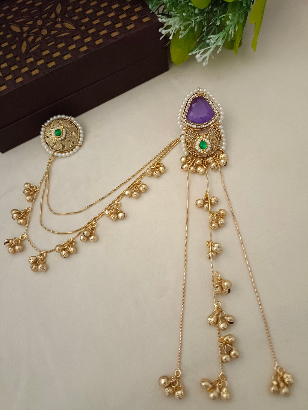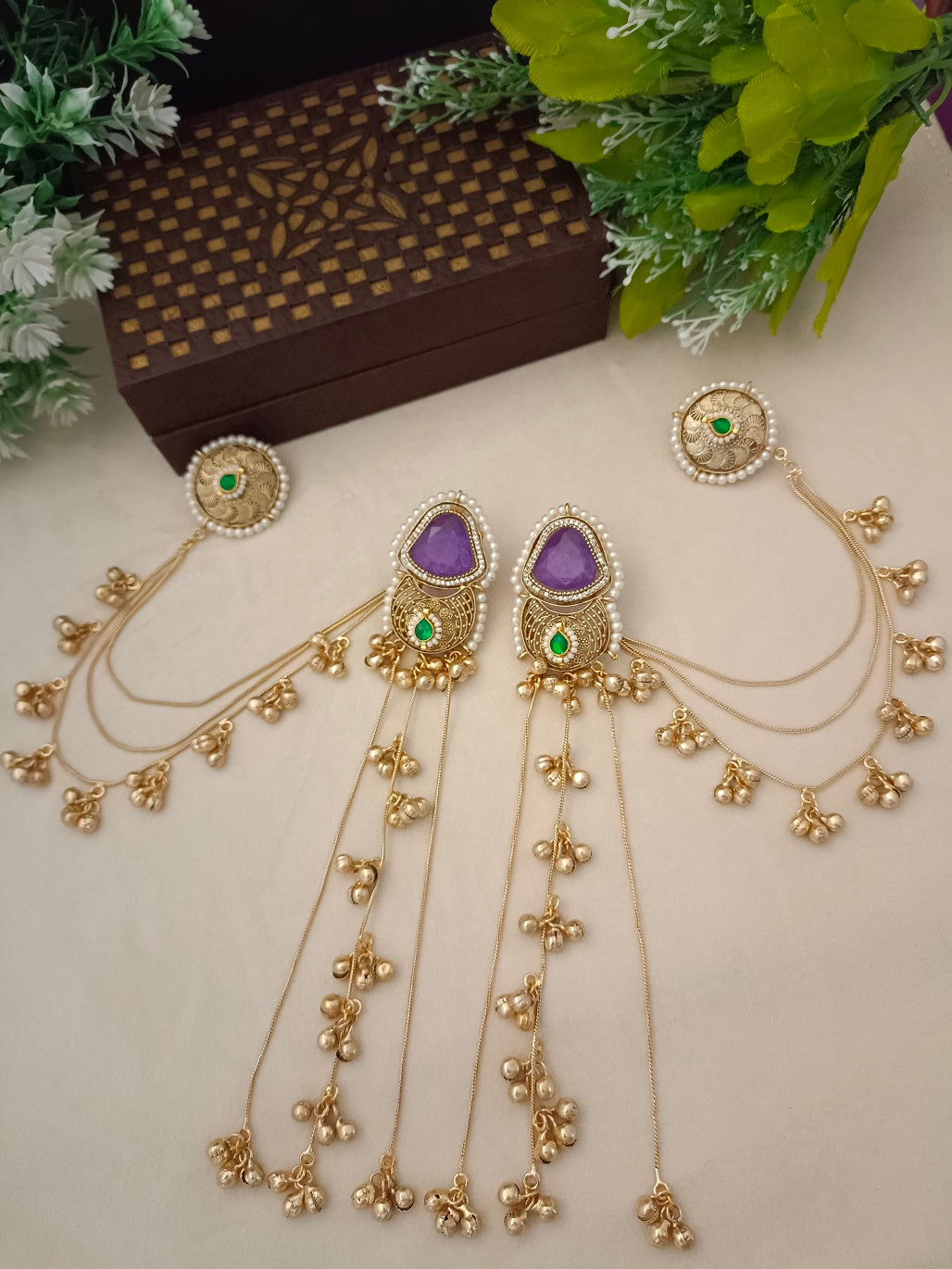 Gold-Toned Purple & White Geometric Drop Earrings | Kundan, Ghungroo Beaded, Kashmiri Earchains