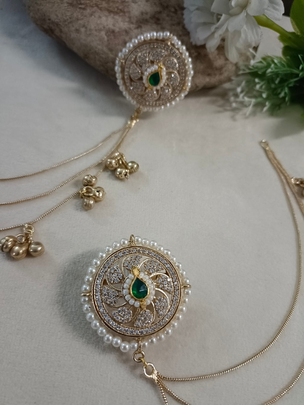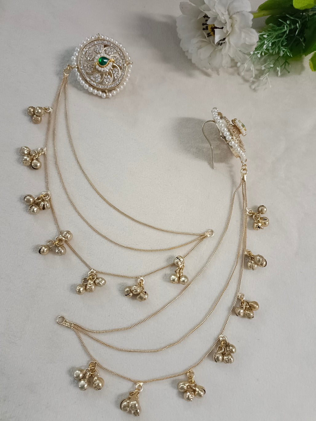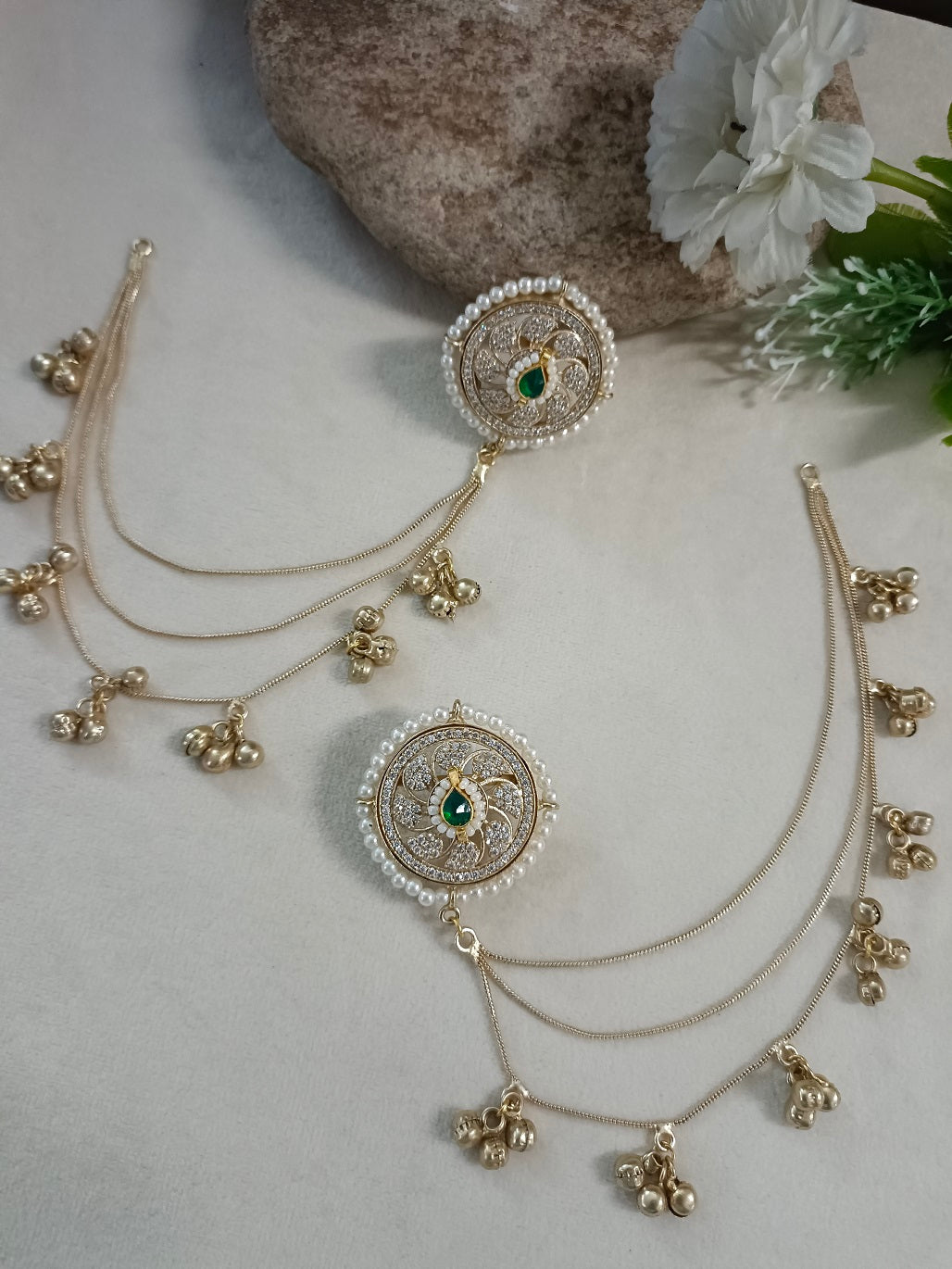 Gold-Toned White Circular Kashmiri Earchains | Kundan Studded Beaded Insert Style
