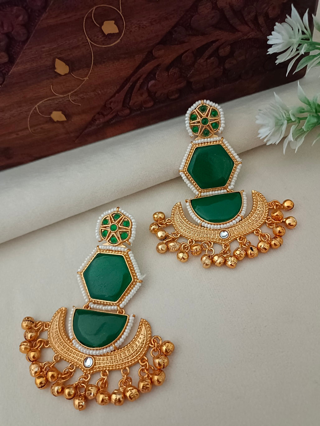 Green & Gold-Toned Geometric Drop Earrings | Kundan Studded, Beaded Brass Post Back