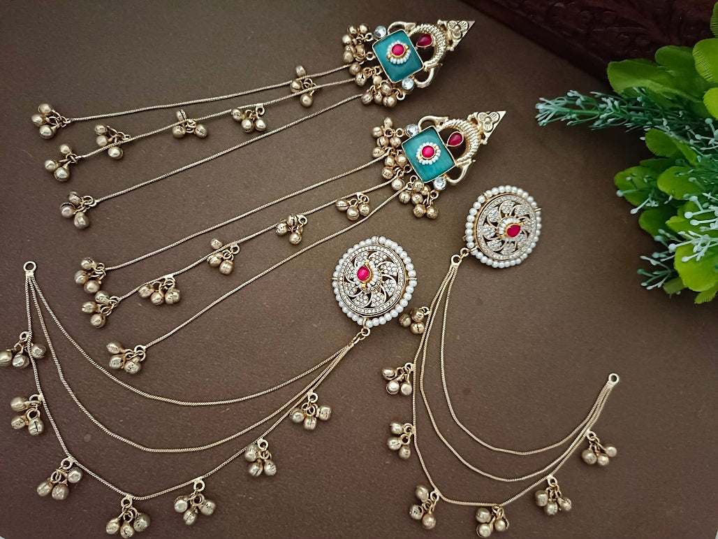 What sets this pair apart is the elegant, attached earchain, a signature element of Kashmiri jewelry that drapes beautifully and adds a dramatic, regal flair. The earchain enhances the overall ethnic look, making these perfect statement earrings for weddings, festive celebrations like Diwali or Eid, or any grand occasion.