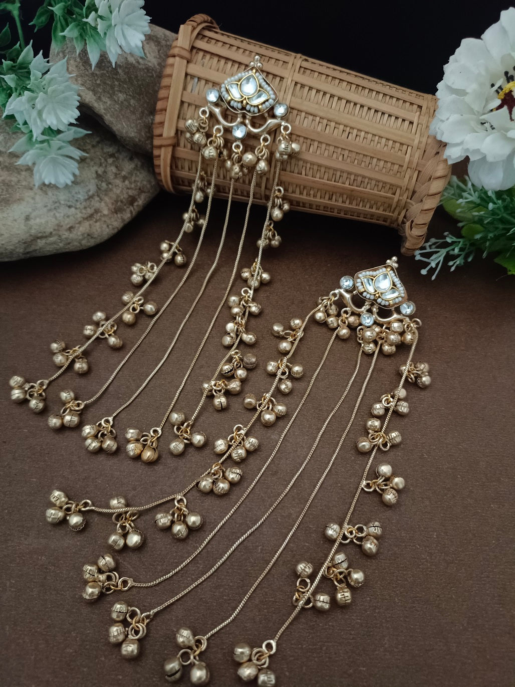 Pachi Kundan & Ghungaroo Studded Teardrop Shaped Kashmiri Drop Earrings