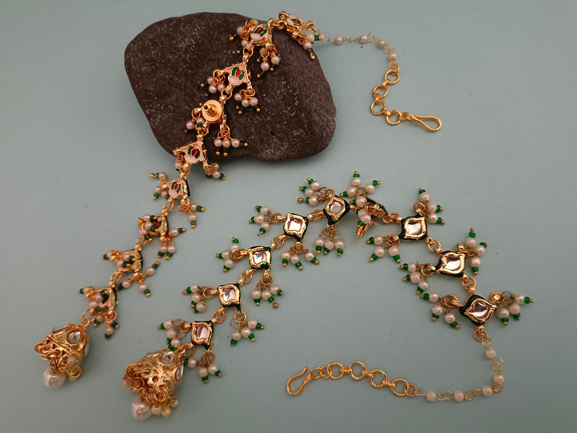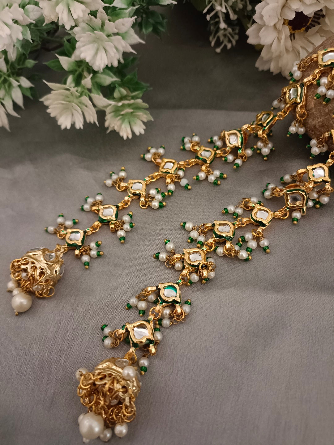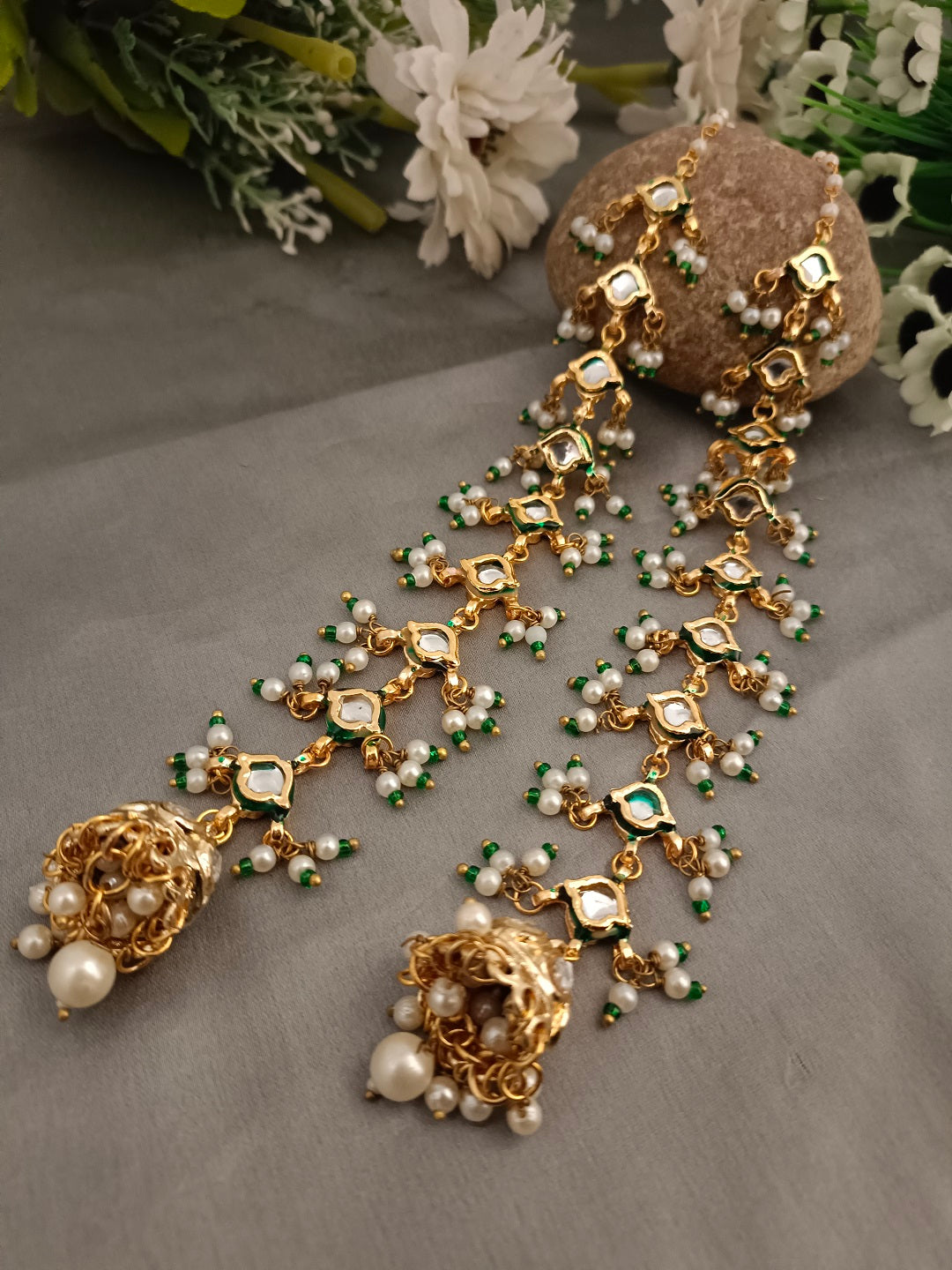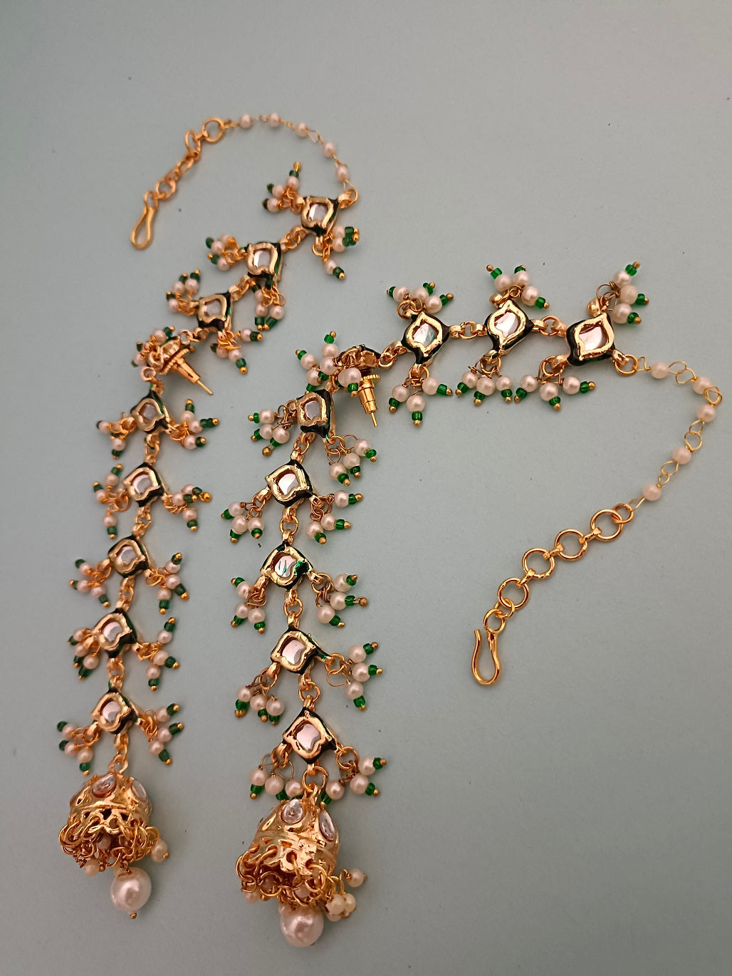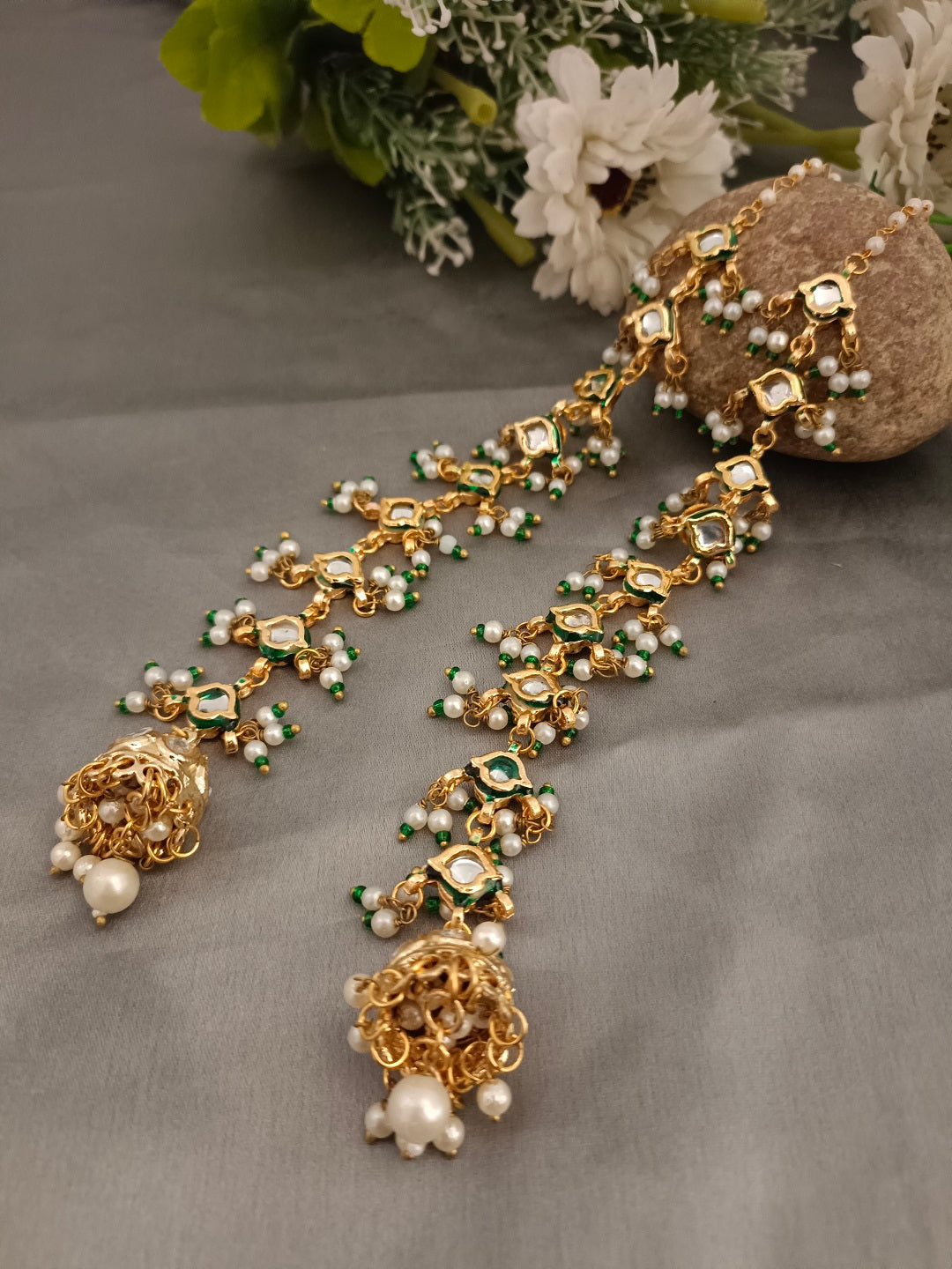 Sanjog Grand Kundan/Polki Jhumka Earrings with Attached Saharay Ear Chain | Gold Plated Meenakari & Pearl Drops for Bridal Wear