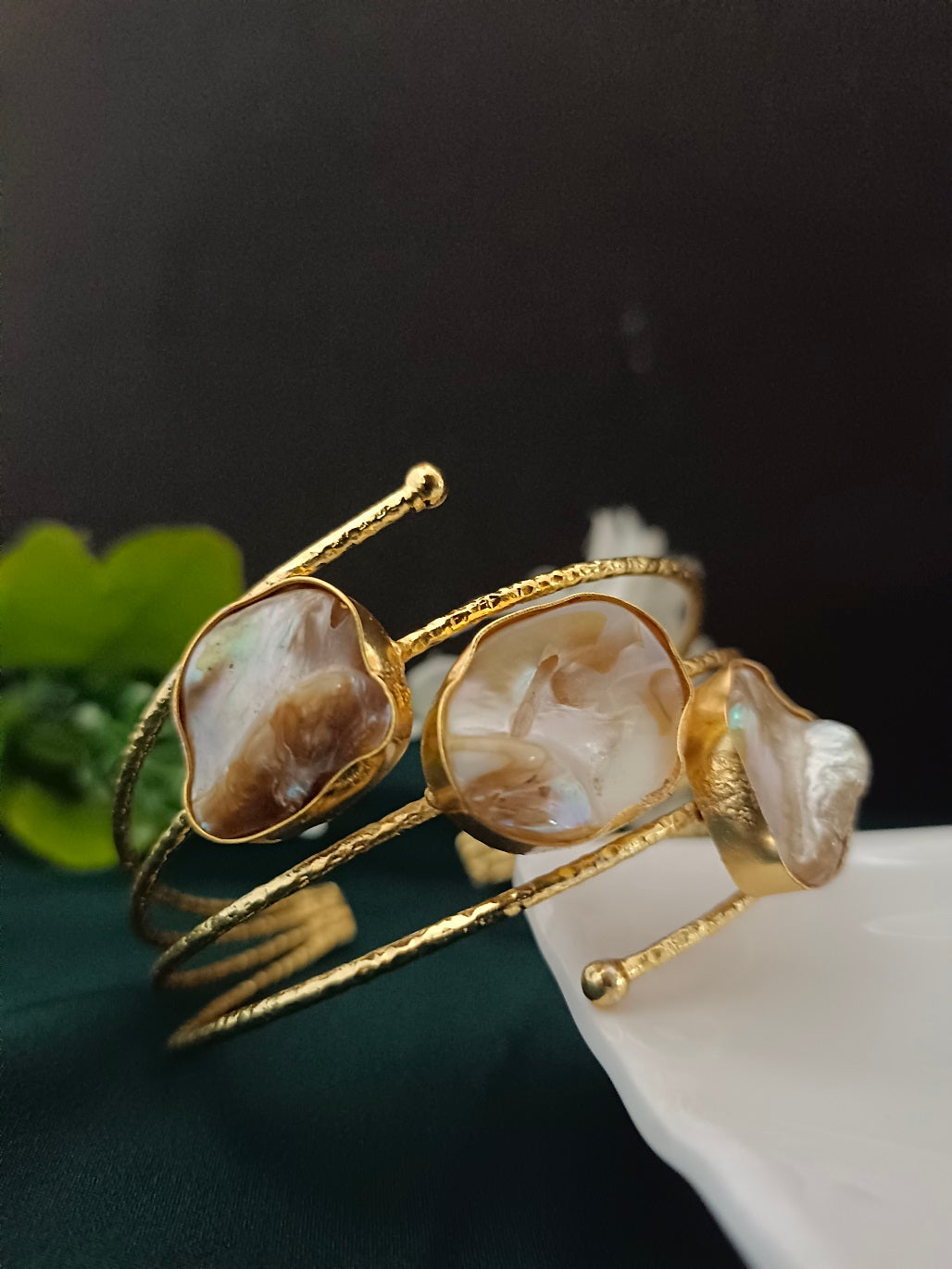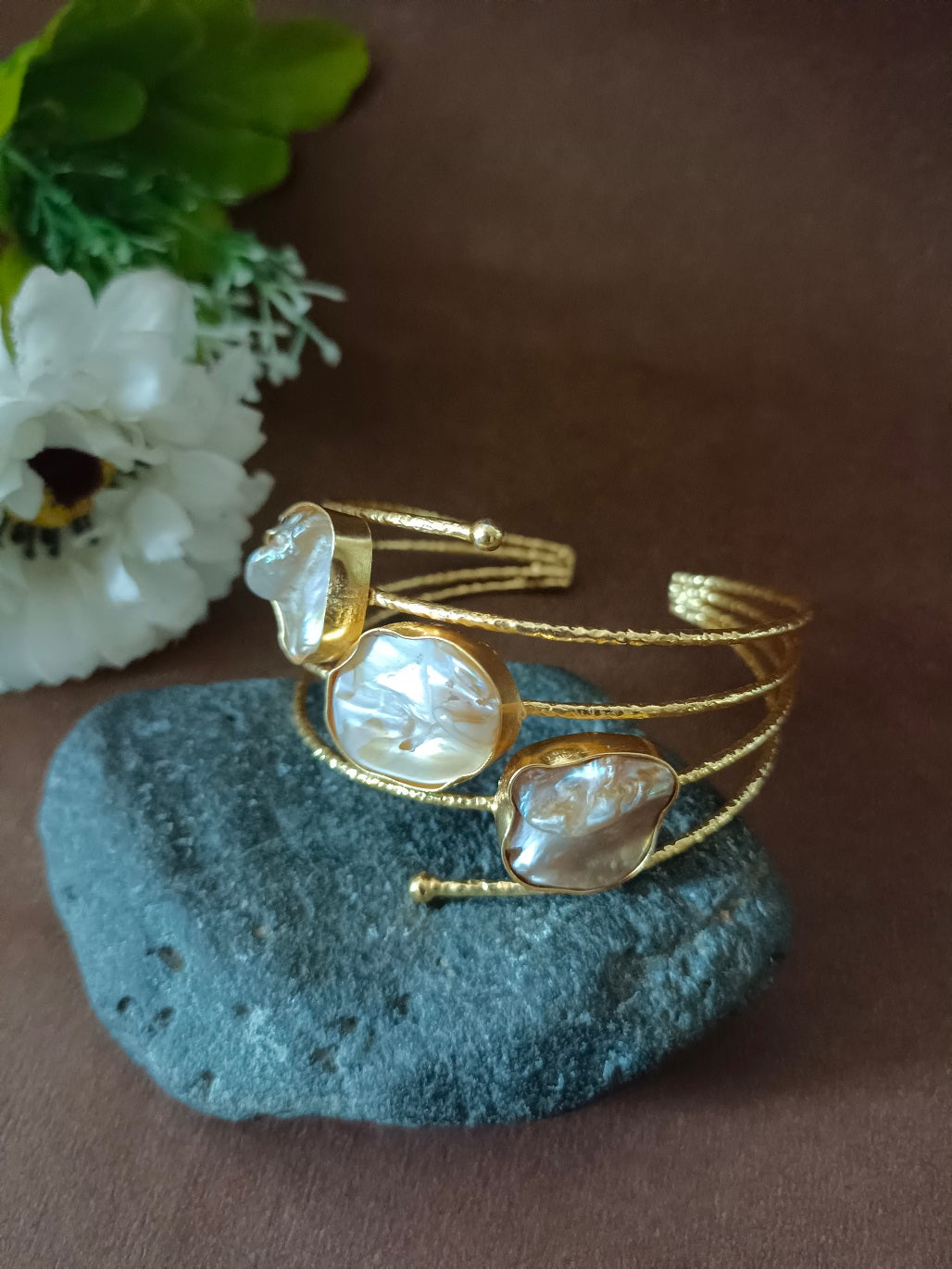 This is a modern and elegant open cuff bracelet with a bohemian flair, crafted in a striking gold-tone finish. The band is constructed from several thin, braided metal strands which wrap around the wrist, providing a unique texture and comfortable, adjustable fit. The focal point of the bracelet is three natural, irregularly shaped Baroque Pearls or Shell Slices, which exhibit a beautiful, iridescent sheen ranging from white to blush pink and grey. Each organic stone is held securely in an uneven bezel setting, creating a fashionable statement piece that seamlessly blends natural elements with contemporary jewelry design.