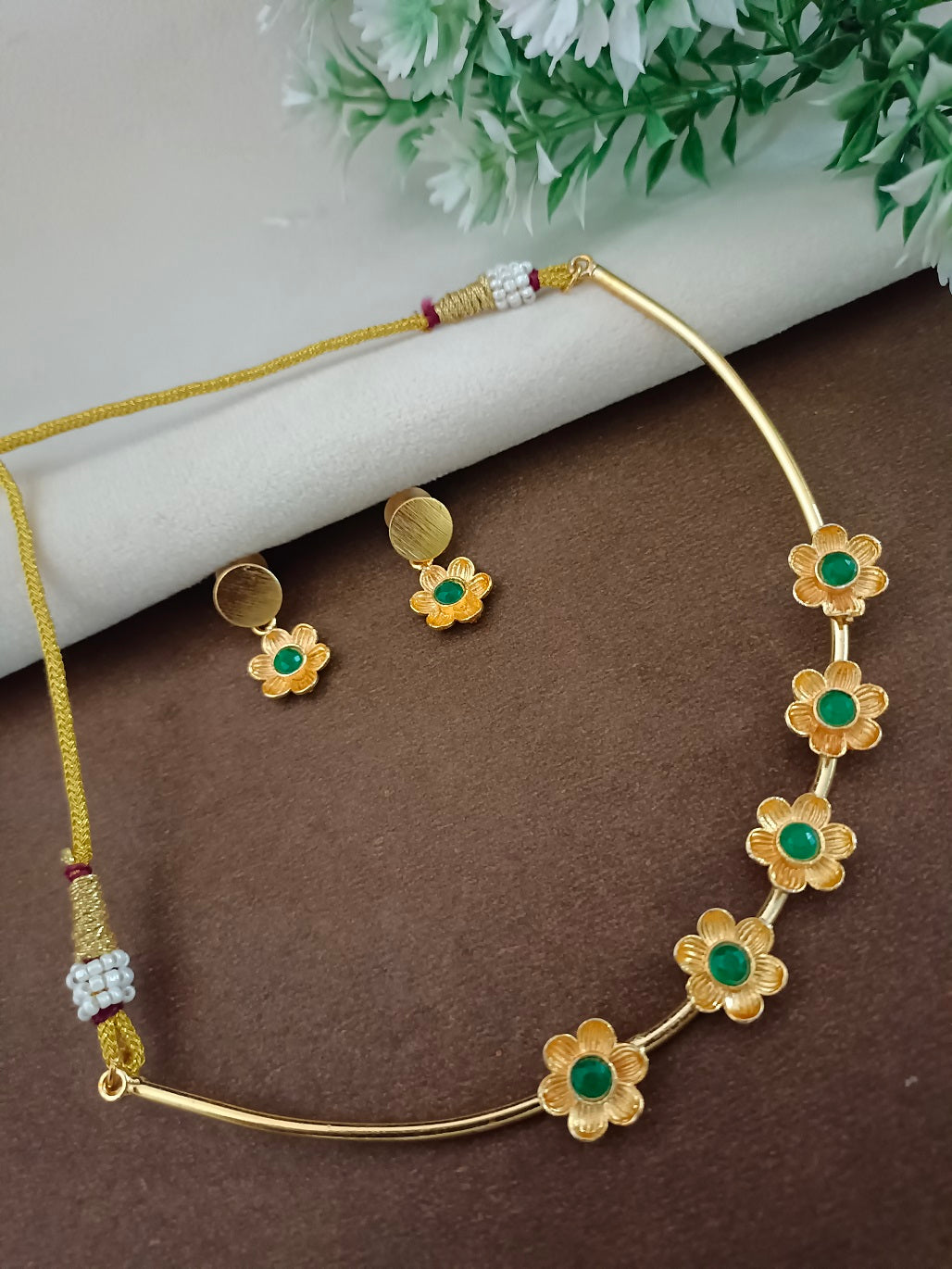 Gold-Plated Green Stone Choker Set | Studded Drop Earrings & Drawstring Closure