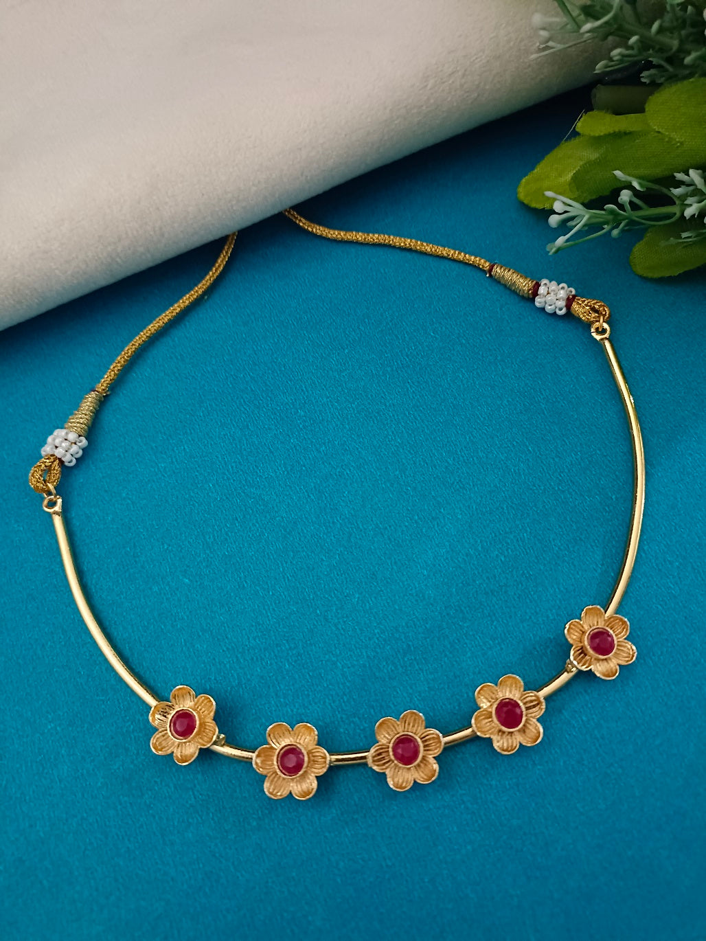 Gold-Plated Pink Kundan Hasli Choker Set | Traditional Studded Earrings & Drawstring