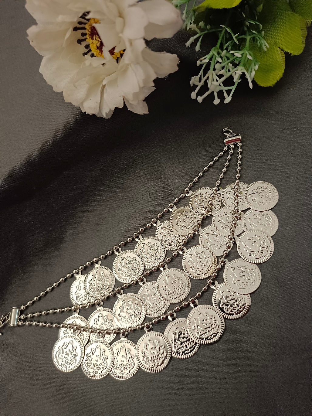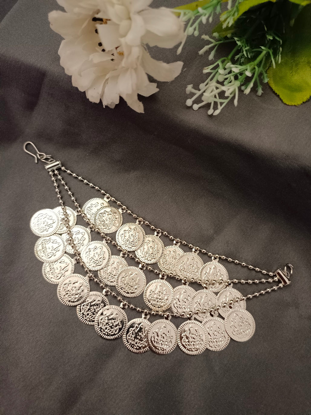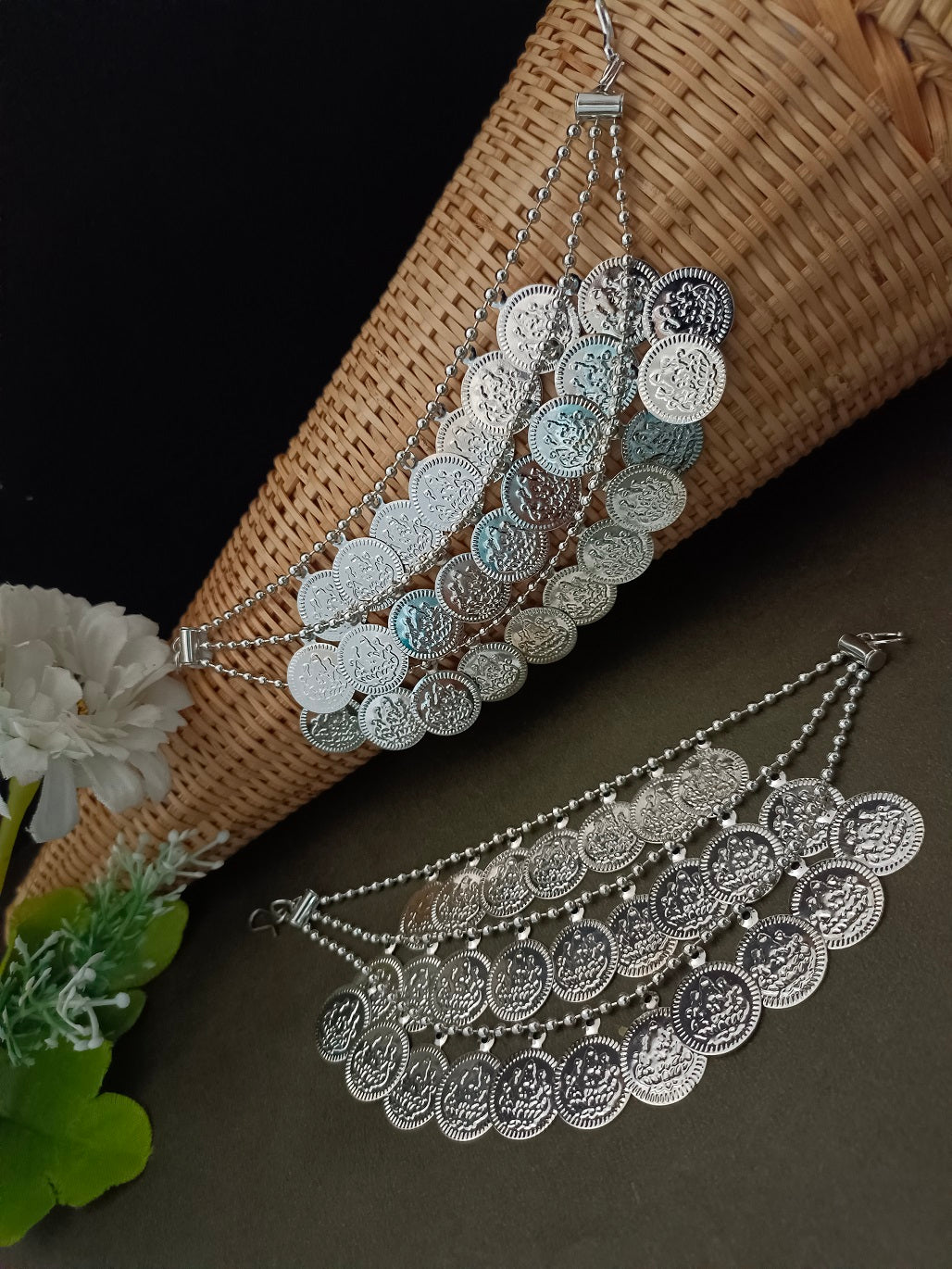 These statement earchains are crafted in an elegant oxidized silver finish. Each piece features multiple strands of ball-beaded chains connected by layers of intricately detailed, embossed coin or medal motifs. The design creates a beautiful, cascading drape that extends from the earring post, framing the face. Lightweight and designed to make an impact, these earchains are perfect for pairing with traditional Indian or bohemian outfits.
