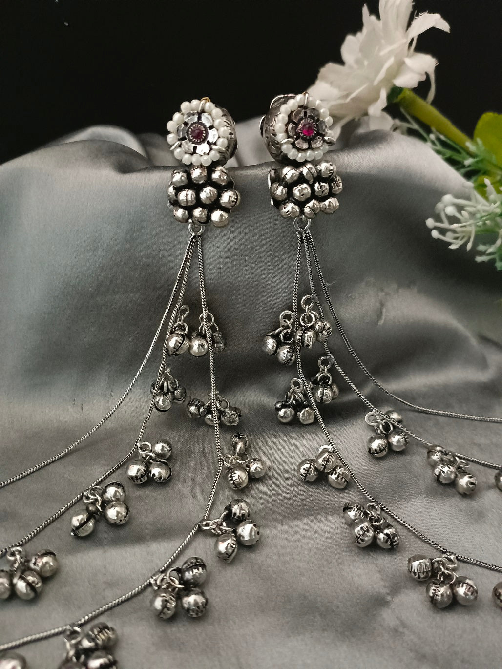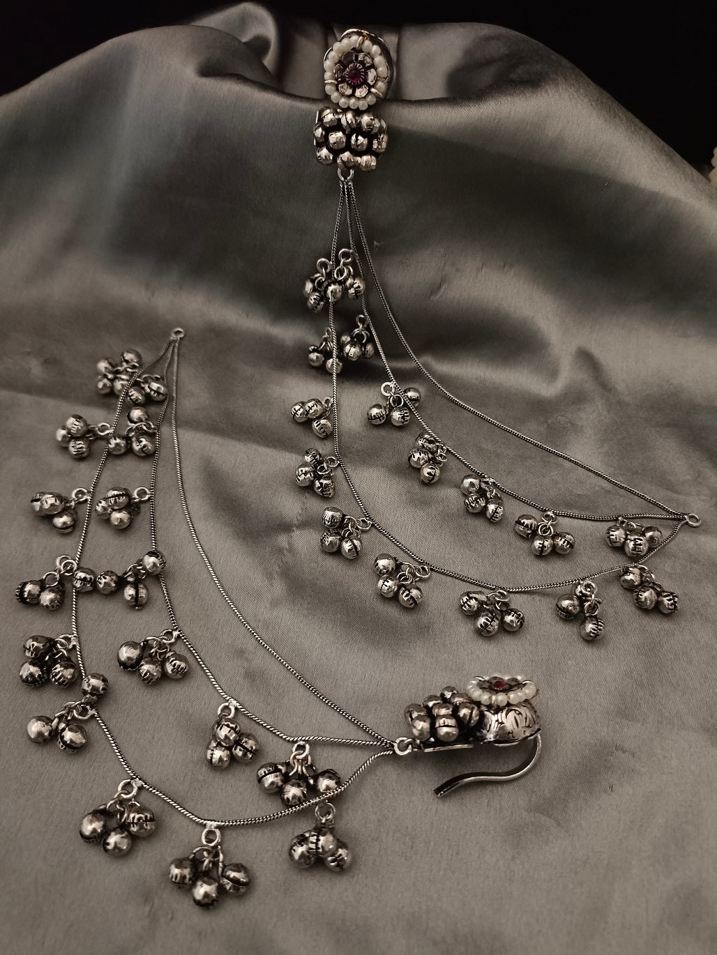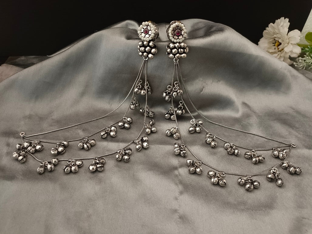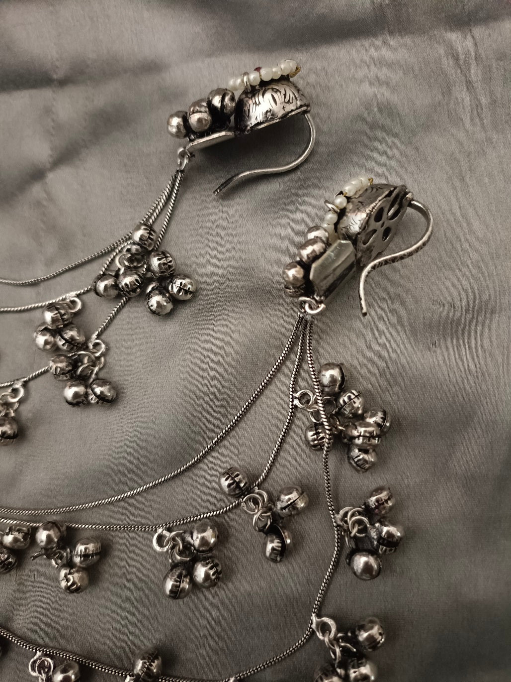 Sanjog Oxidized Silver Ear Chains (Kaan Chain) with Floral Pearl Studs and Tiered Ghungroo Bells