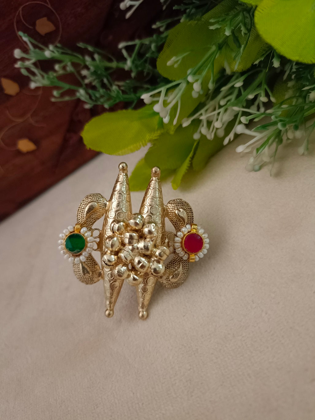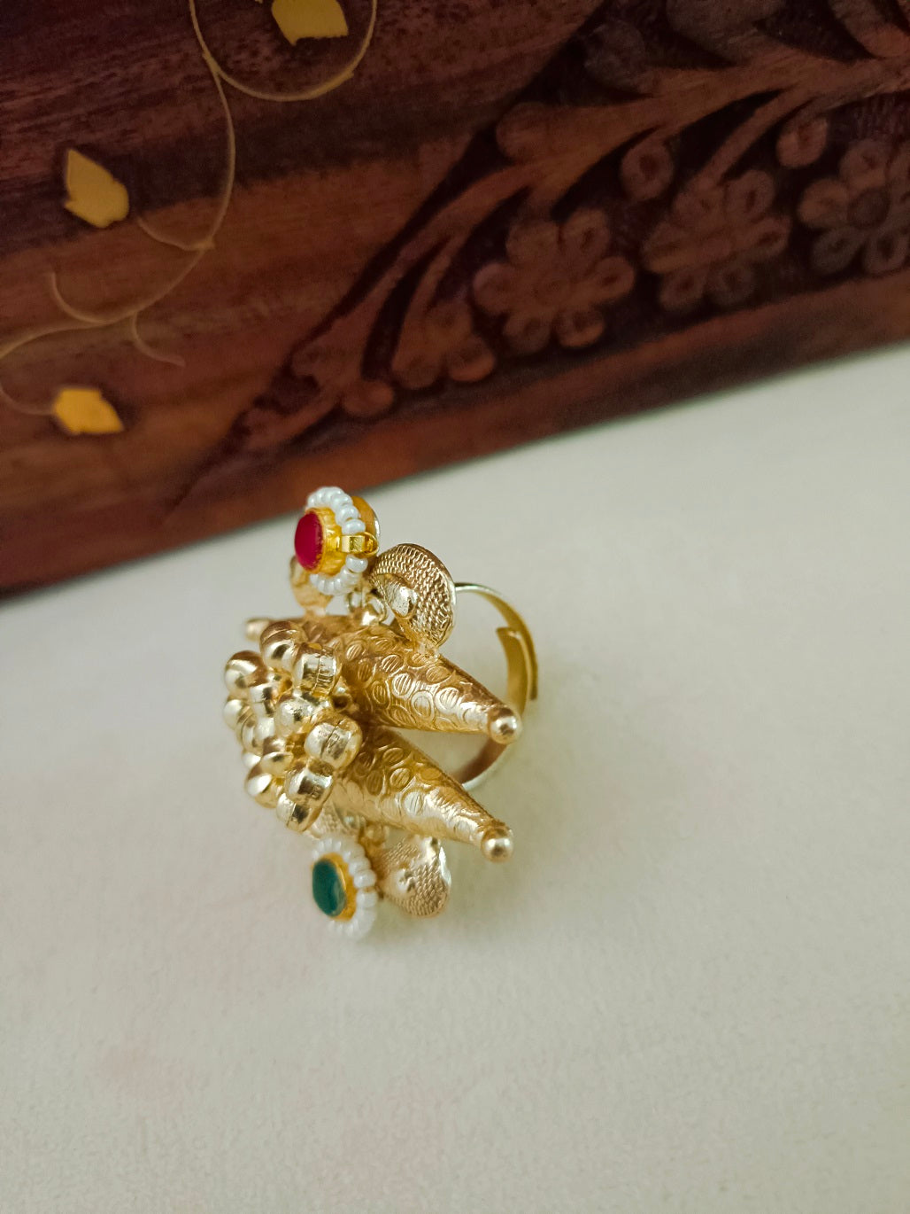 Gold-Plated Red & Blue Adjustable Finger Ring | Artificial Stones Studded & Beaded