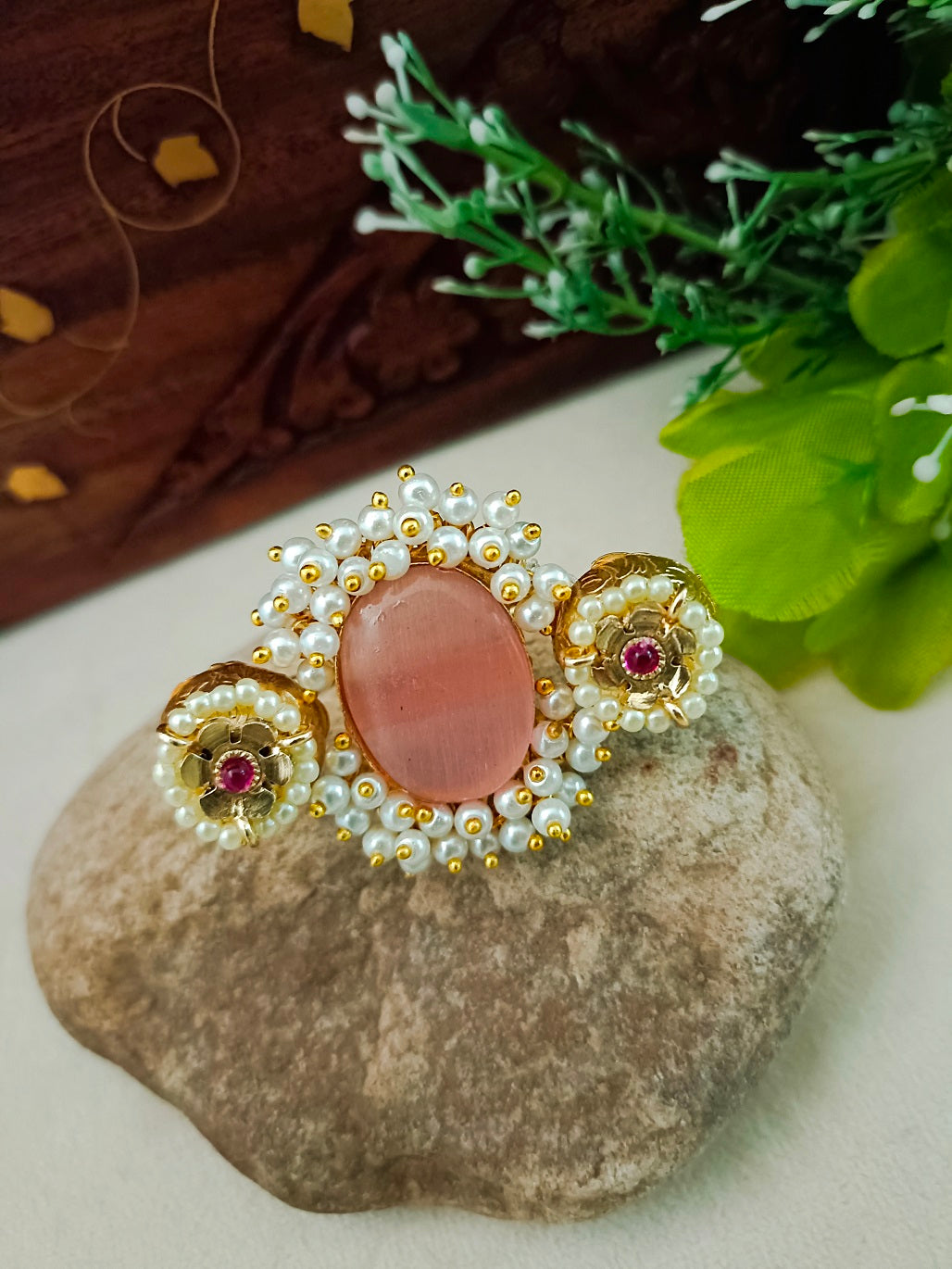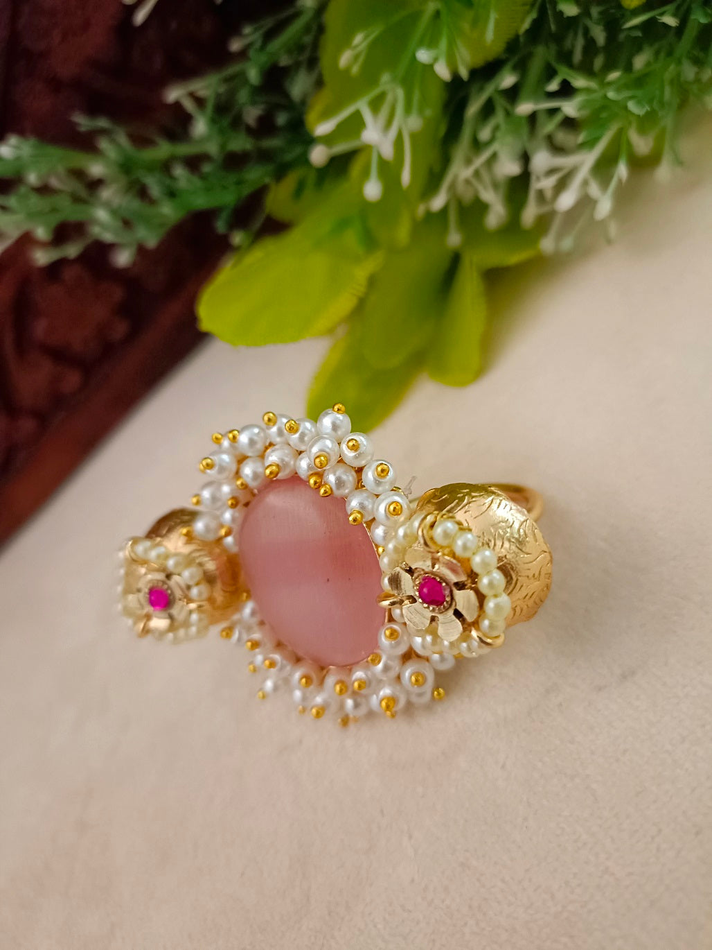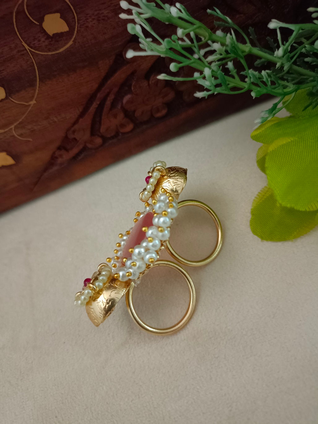 Gold-Toned Pink & White Double Finger Ring | Artificial Stones Studded & Beaded