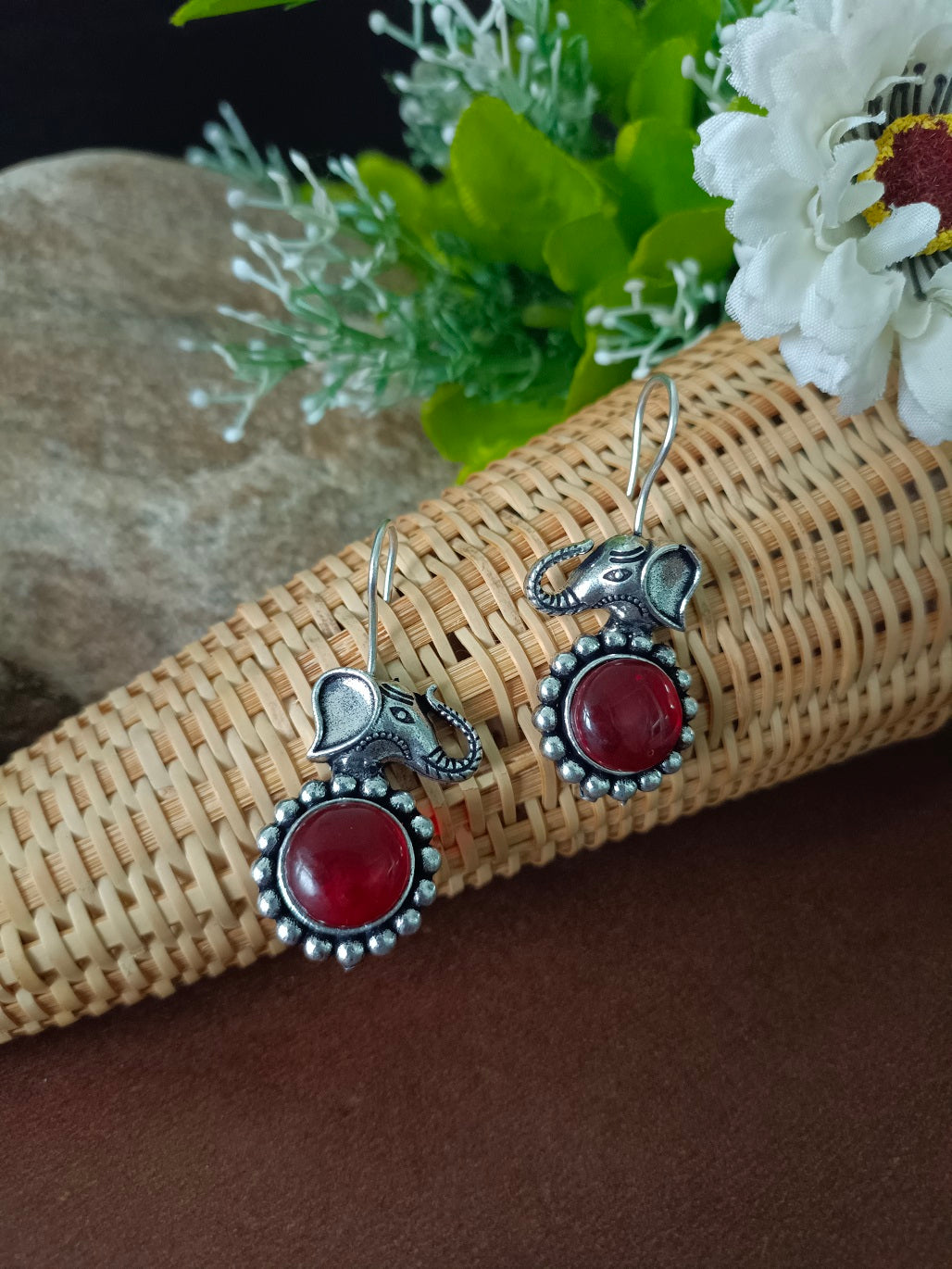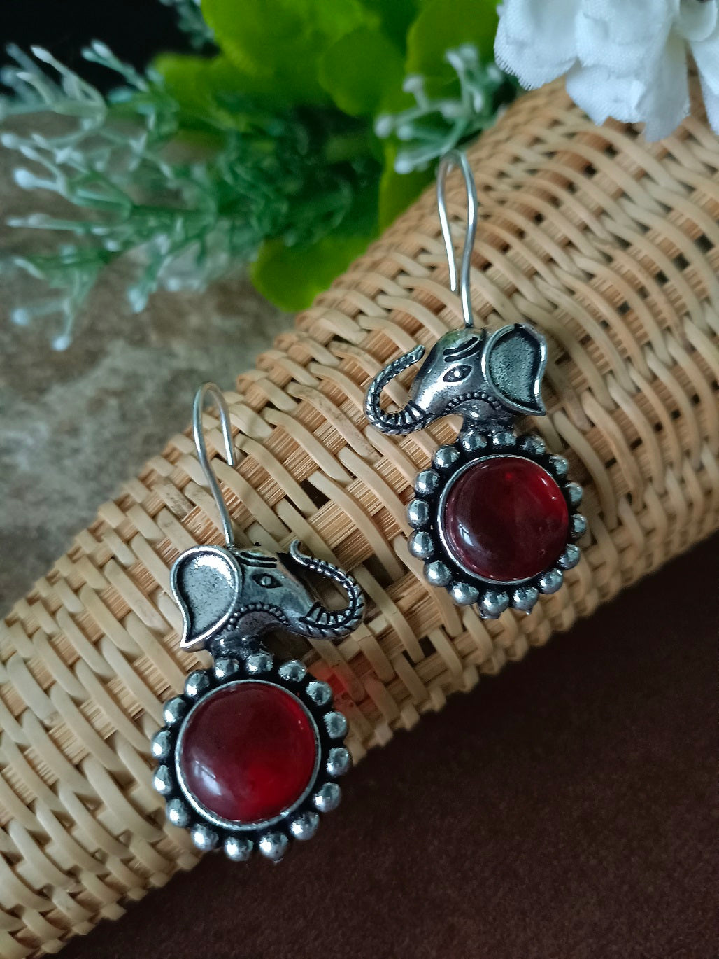This captivating pair of drop earrings features a striking combination of Bohemian and Ethnic styles, highlighted by an oxidized silver finish that creates an antique and Tribal jewelry appeal. The design is centered around a detailed Elephant head motif (Gaja/Hathi) with its trunk raised, connecting to a simple fish hook earwire. Below the elephant, a round medallion holds a vibrant, smooth red stone (likely glass, resin, or coral-style), beautifully framed by a beaded border that emphasizes the vintage look. These versatile and lightweight Boho earrings are ideal for adding a pop of color to everyday wear, casual outfits, and perfectly complement ethnic attire like Kurtis and sarees, making them a distinct fashion jewelry statement.
