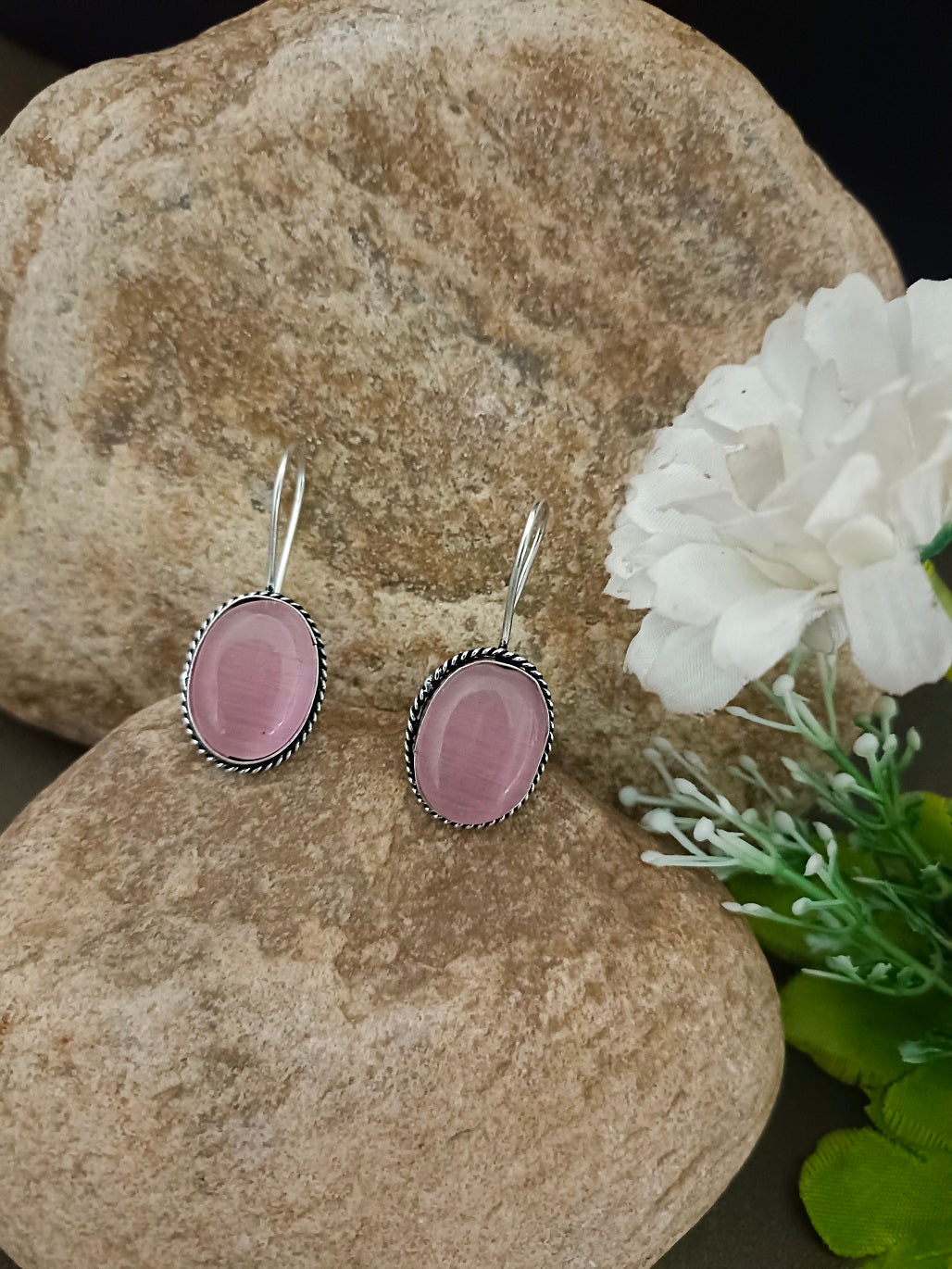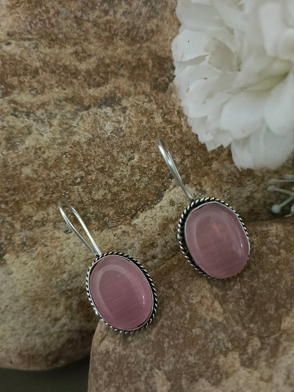Sanjog Oxidized Silver Oval Drop Earrings with Pink Cat's Eye Stone