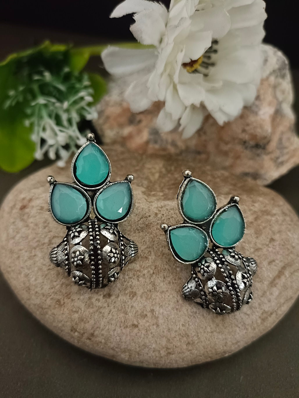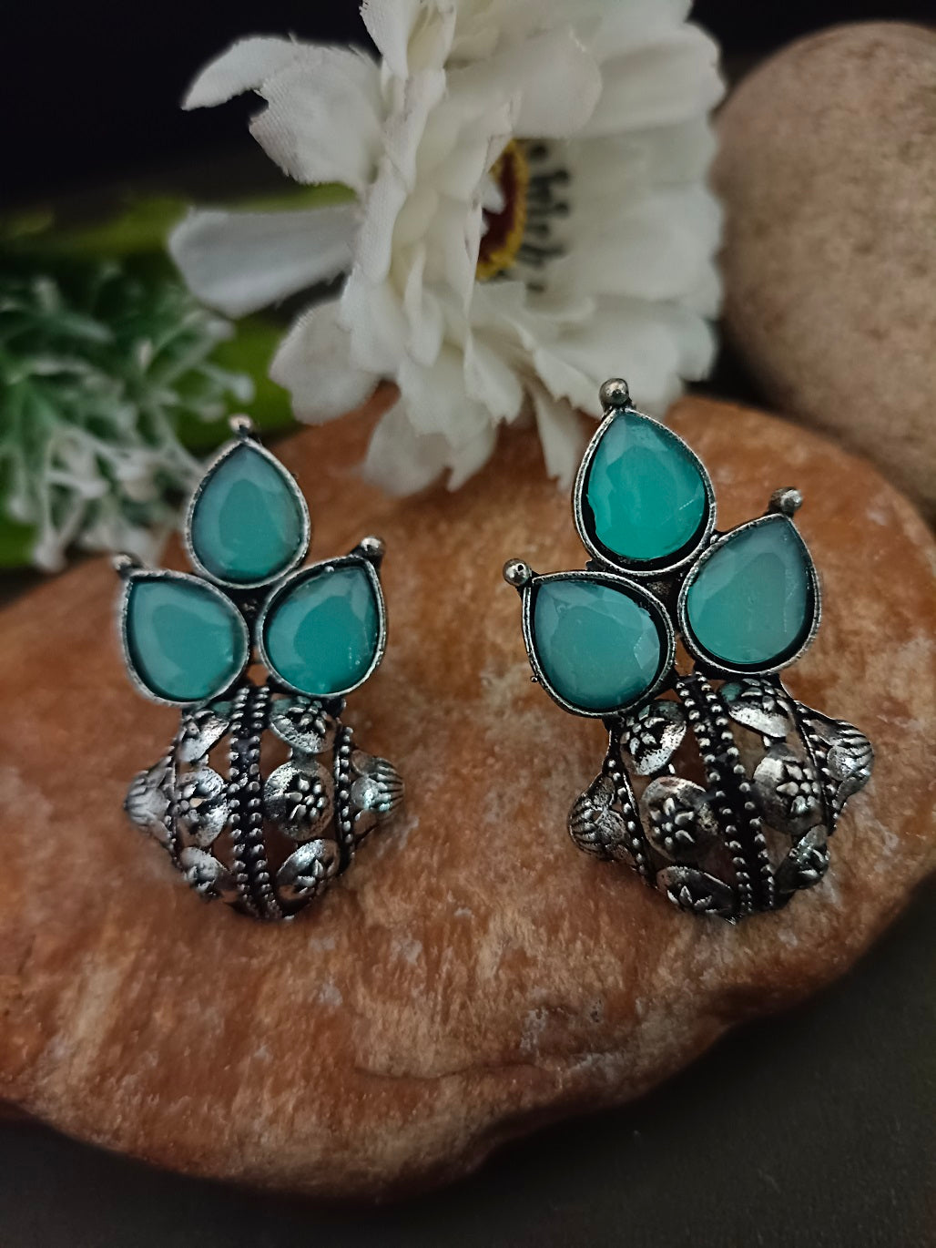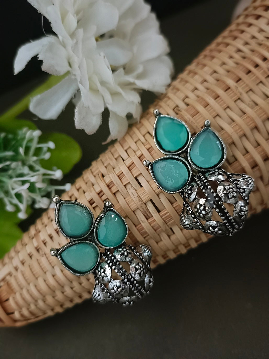 Sanjog Oxidized Silver-Tone Mint Green Stone Cluster Stud Earrings with Intricate Dome Base