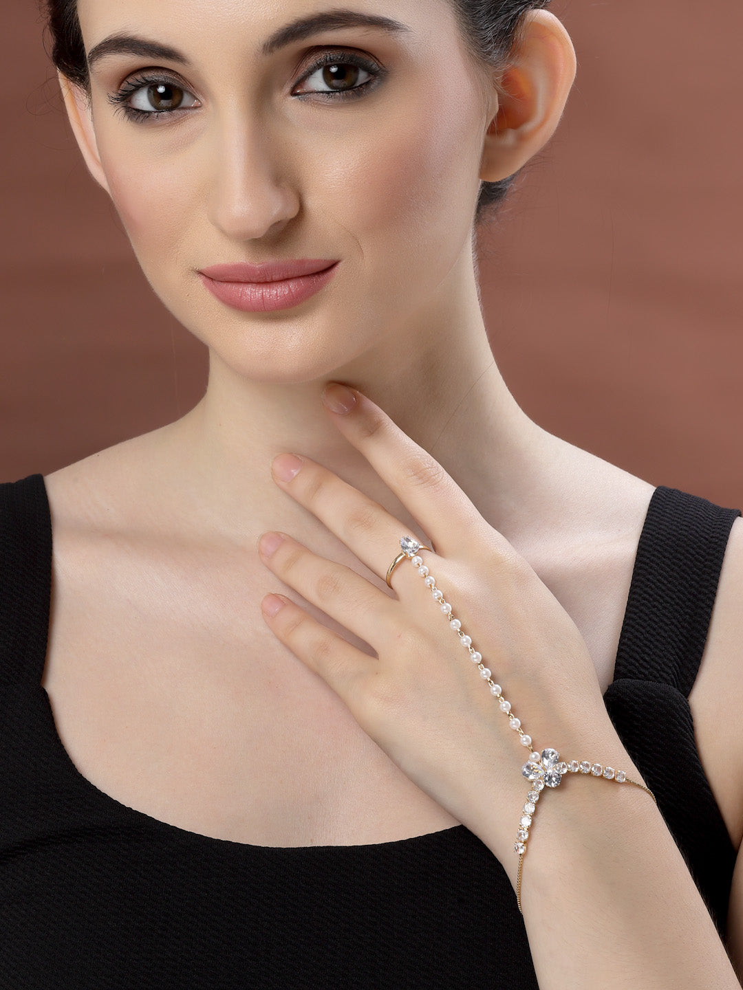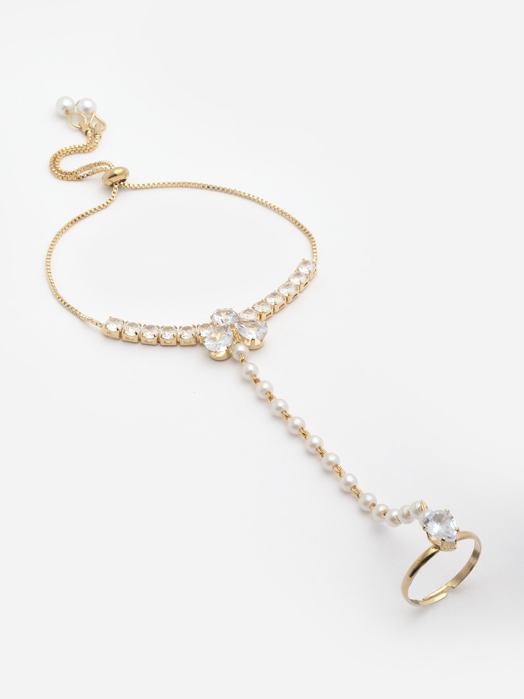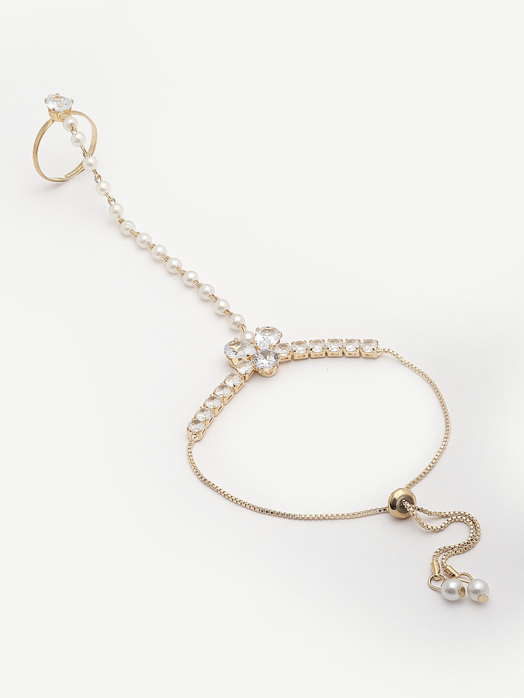 Gold-Plated Crystals & AD Stone Studded Finger Ring Hathphool Pearl Bracelet
