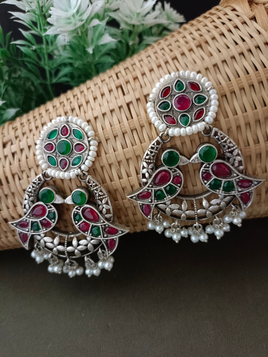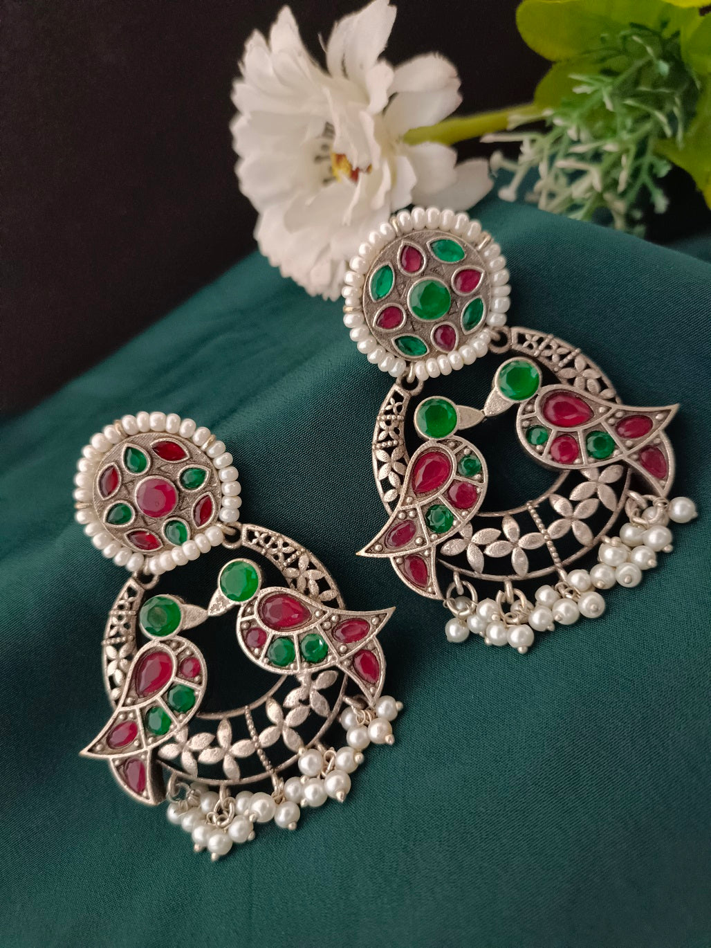 These are magnificent traditional drop earrings crafted in an antique oxidized silver-tone finish. The design features a two-part construction: a round stud top adorned with alternating ruby-red and emerald-green accent stones and a faux pearl border. Below this, a large, ornate circular or crescent-shaped dangle showcases a beautiful dual-bird motif (likely peacocks or similar stylized birds) outlined in silver and filled with corresponding red and green accent stones. The openwork metal base features delicate floral and leaf cutouts, and the entire bottom edge is finished with a stunning fringe of small, dangling faux pearl beads, creating a grand, colorful, and detailed statement piece perfect for festive and wedding attire.