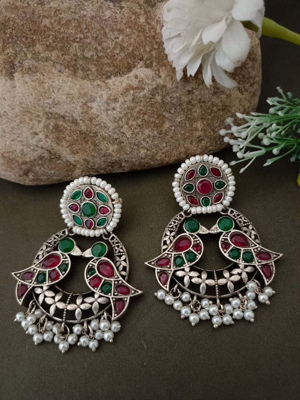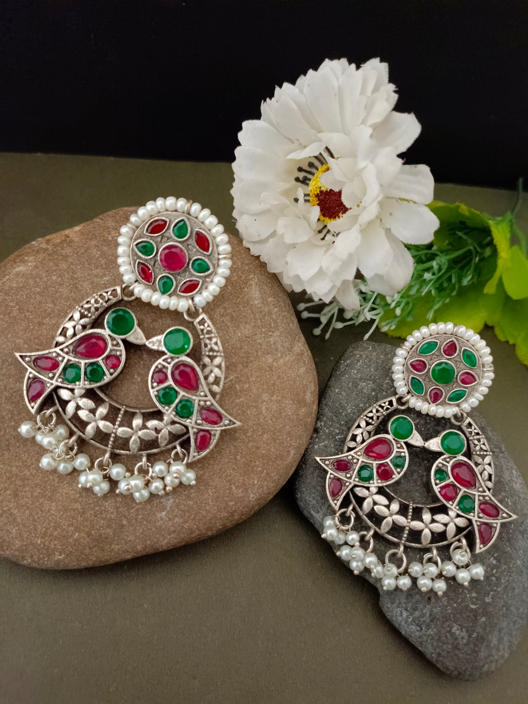 Sanjog Grand Oxidized Silver-Tone Bird Motif Drop Earrings with Multi-Color Stones and Pearl Fringe