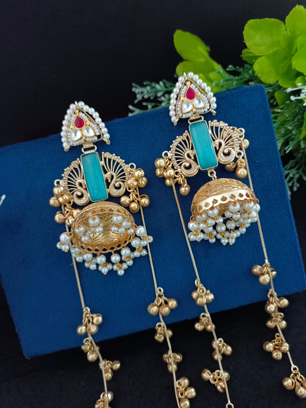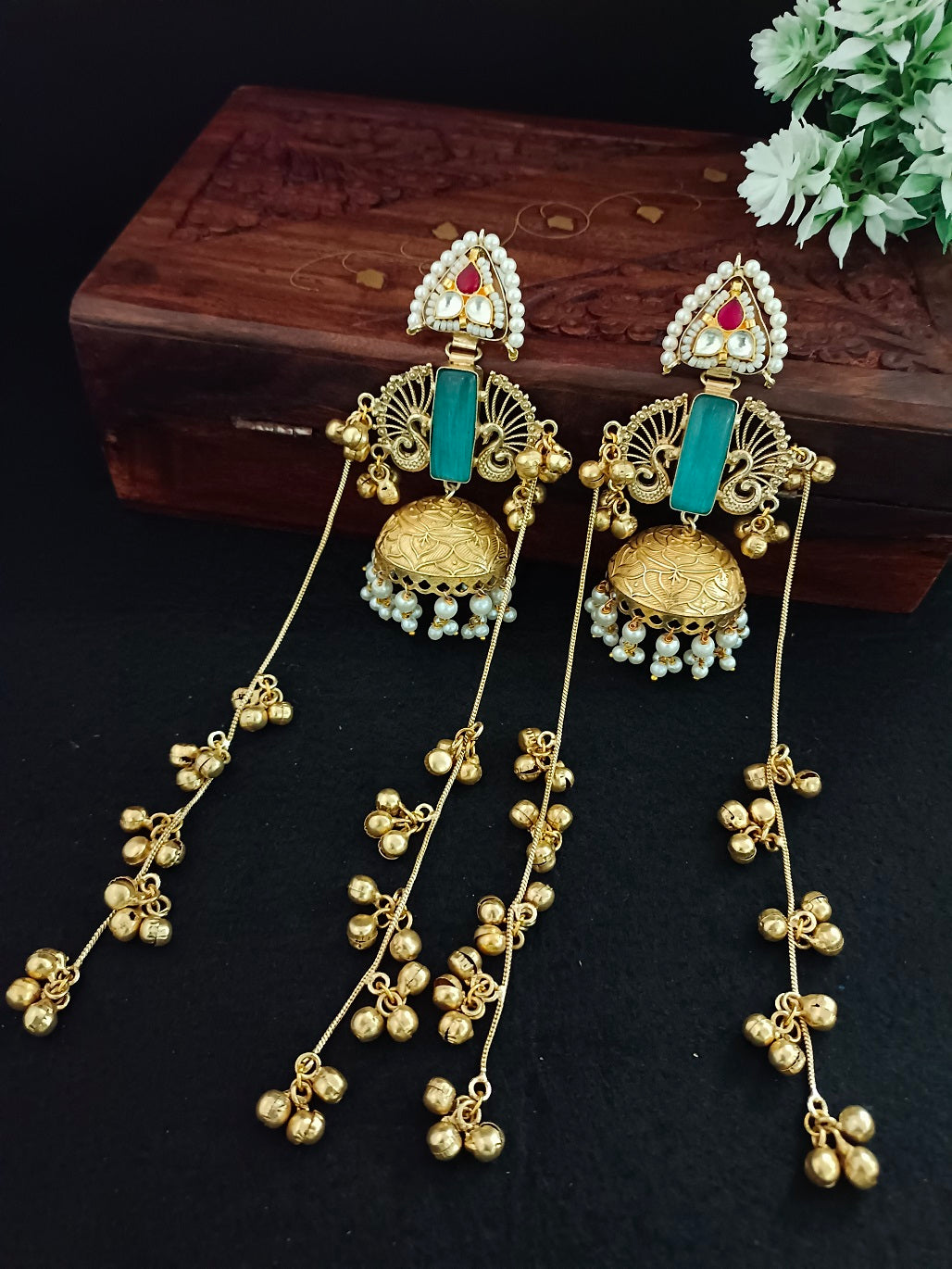 Gold-Toned Geometric Jhumka Earrings | Brass-Plated with Kundan & Post Back Closure