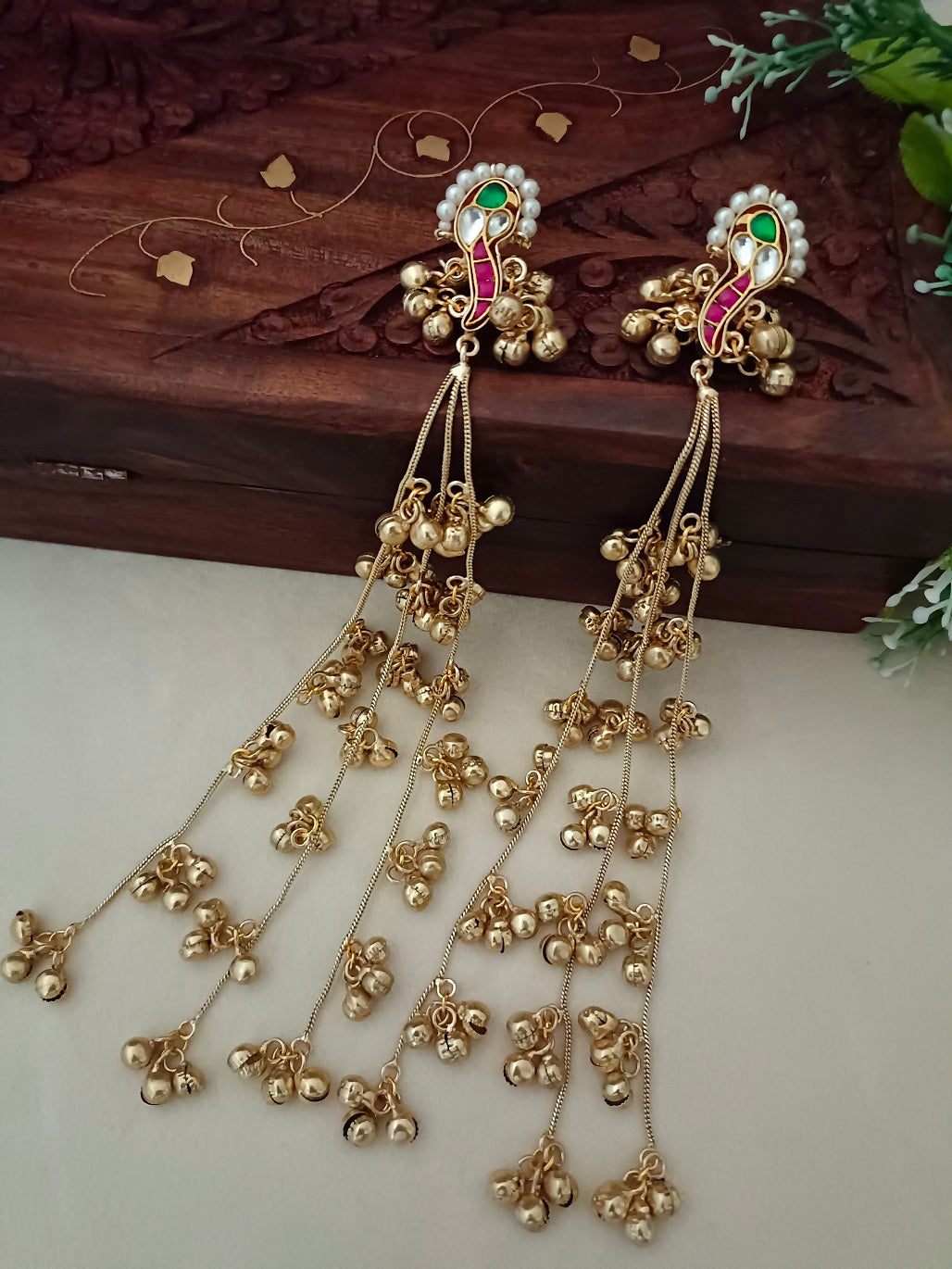 Gold-Toned Pink Peacock Drop Earrings | Kashmiri Style, Kundan & Beaded Brass Post Back