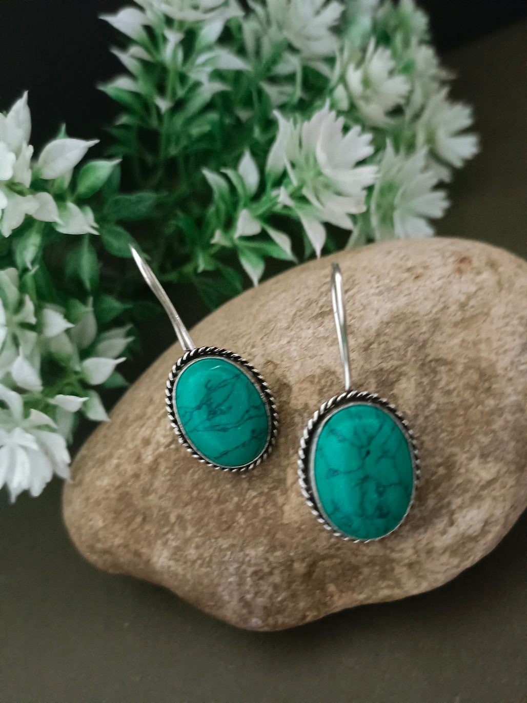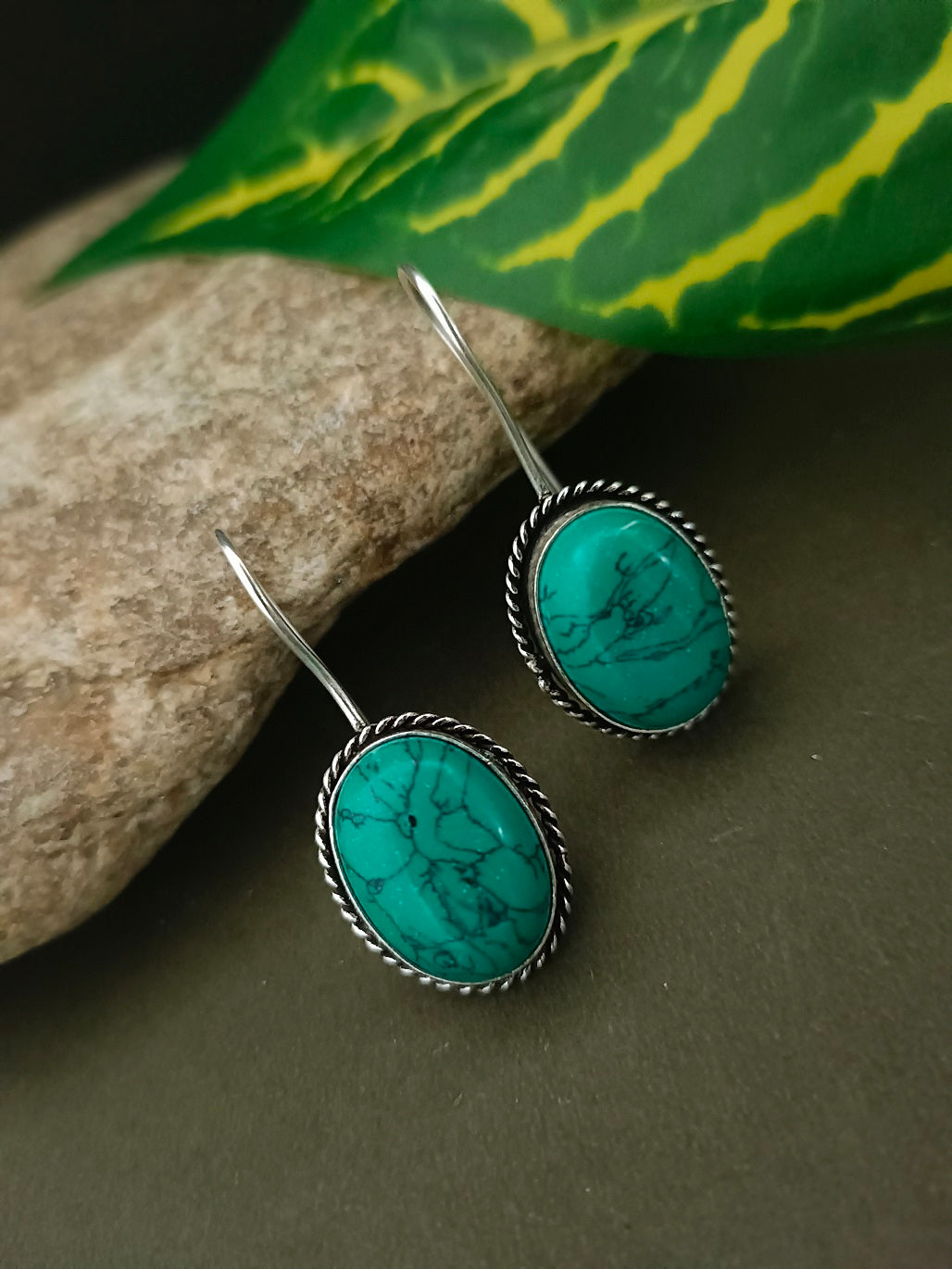 This stunning pair of drop earrings perfectly captures a bold Bohemian and Ethnic style, featuring a rich oxidized silver finish that gives them an antique and Tribal jewelry appeal. Each earring showcases a large, smooth oval cabochon stone in a vibrant turquoise color, characterized by natural-looking dark veining (likely a reconstructed or stabilized Howlite/resin stone). The stone is elegantly framed by a detailed rope-texture bezel, enhancing the vintage charm. Secured by a simple wire hook closure, these striking yet lightweight earrings are incredibly versatile. They are ideal for adding a brilliant pop of color to everyday wear, casual outings, and look fantastic when paired with ethnic outfits like Kurtis or fusion wear. They make a noticeable, yet simple, statement in fashion jewelry.