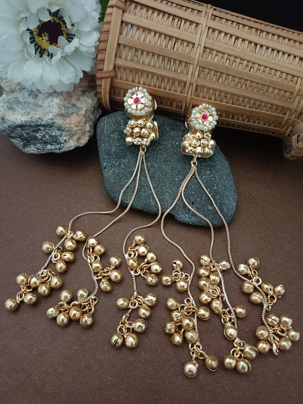 Sanjog Traditional Gold-Tone Jhumka Chain Drop Earrings with Pearls and Ghungroo Bells
